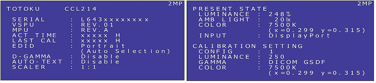 Fabryczne menu monitora OSD Numer katalogowy, numer seryjny, całkowity czas świecenia, ustawienia kalibracji (czas świecenia od ostatniej kalibracji, luminancja, gamma , etc.), aktualna luminancja, etc.